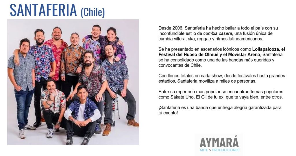 Para contrataciones de artistas (Nacionales o extranjeros) o para el arriendo de equipos para eventos nos puede escribir a contacto@aymaraproduccioneschile.cl o puede llenar el formulario de contacto pinchar AQUÍ.